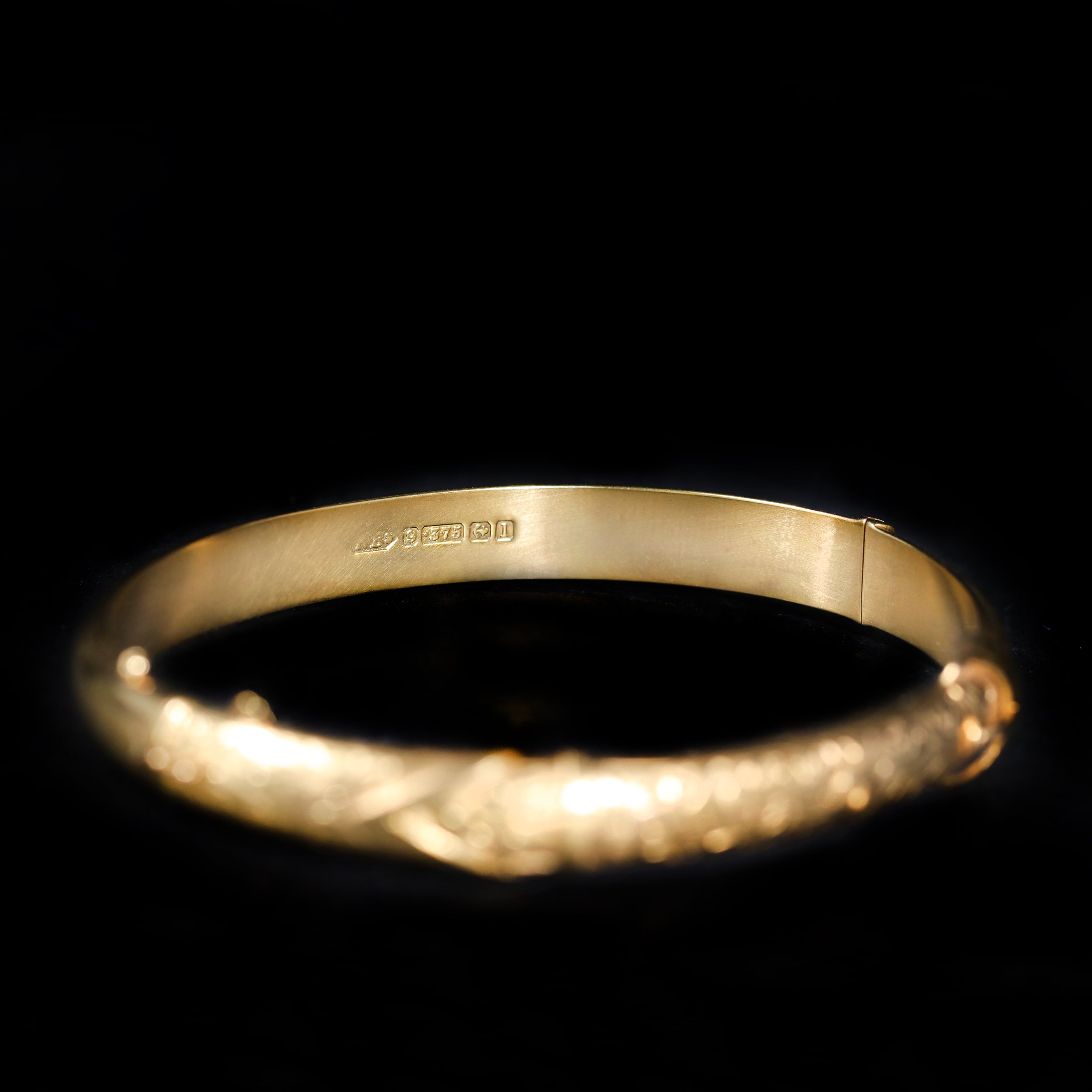Victorian 9K yellow gold buckle bracelet. Crafted in warm 9K yellow gold, this Victorian bangle showcases the beloved buckle motif, its interlocking design long cherished as a symbol of loyalty and enduring love or friendship that never loosens. Delicate engraving curves along the domed top, catching the light and adding soft dimension and that unmistakable Victorian sweetness. Hallmarked in Birmingham, England, its simple, graceful silhouette makes it wonderfully wearable — just as charming on its own as it is layered with your go-to antique or modern stack. The hinged bangle comfortably fits a size 7-inch wrist.