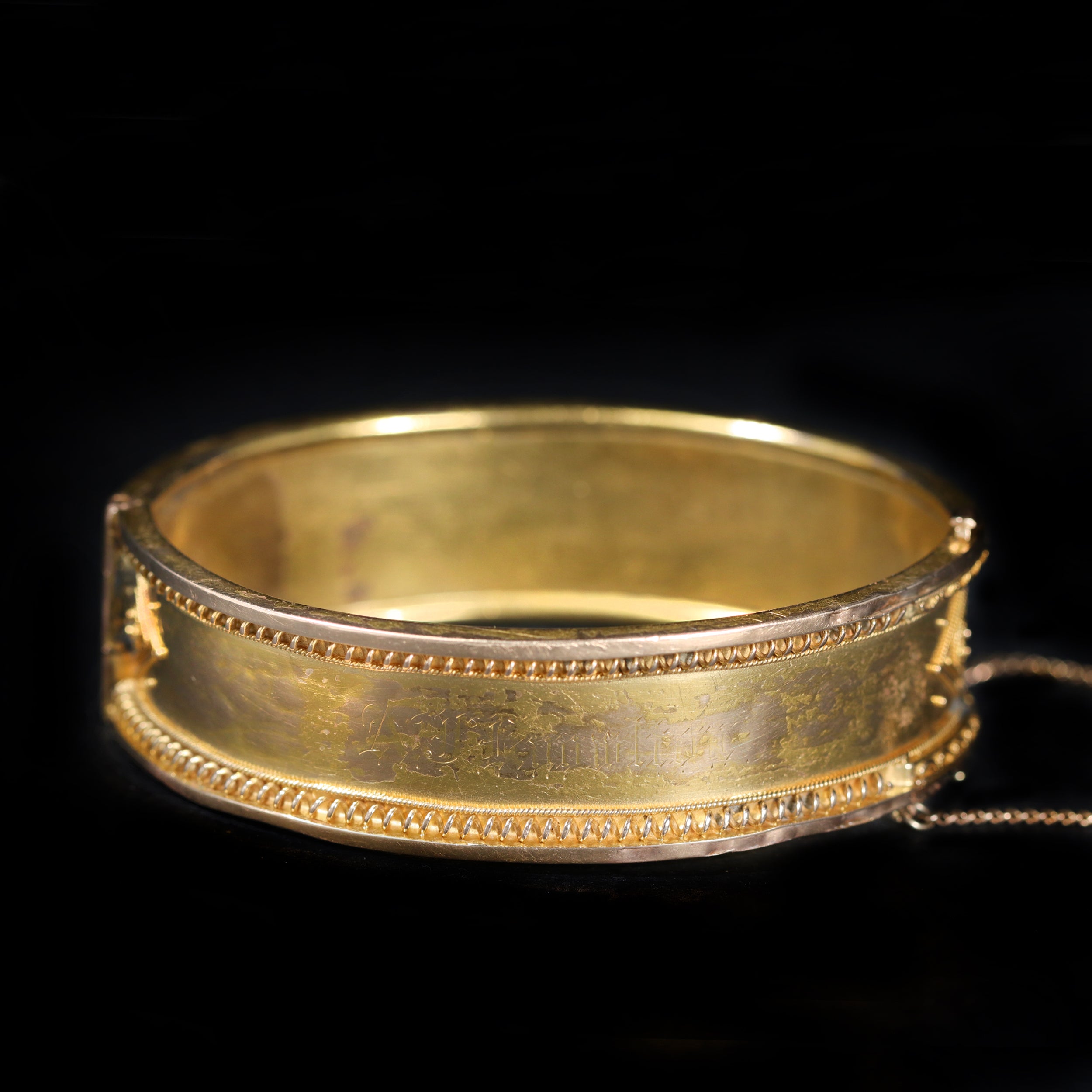 Victorian 14K/18K yellow gold bracelet. A remarkable piece of late 19th-century design, this Victorian Etruscan Revival bangle bracelet is crafted in richly hued yellow gold. The surface showcases the intricate granulation and wirework characteristic of Etruscan Revival jewelry—an art form beloved during the Victorian era for its nod to ancient craftsmanship. Inside the hinge, two patent stamps read “PAT. OCT 14 1875” and “PAT. MAY 11 1880,” dating the bracelet to this elegant and inventive period of goldwork. Both sculptural and sophisticated, it is a beautifully preserved example of the opulent style that defined the height of Victorian jewelry design. The bracelet comfortably fits a 7-inch wrist.