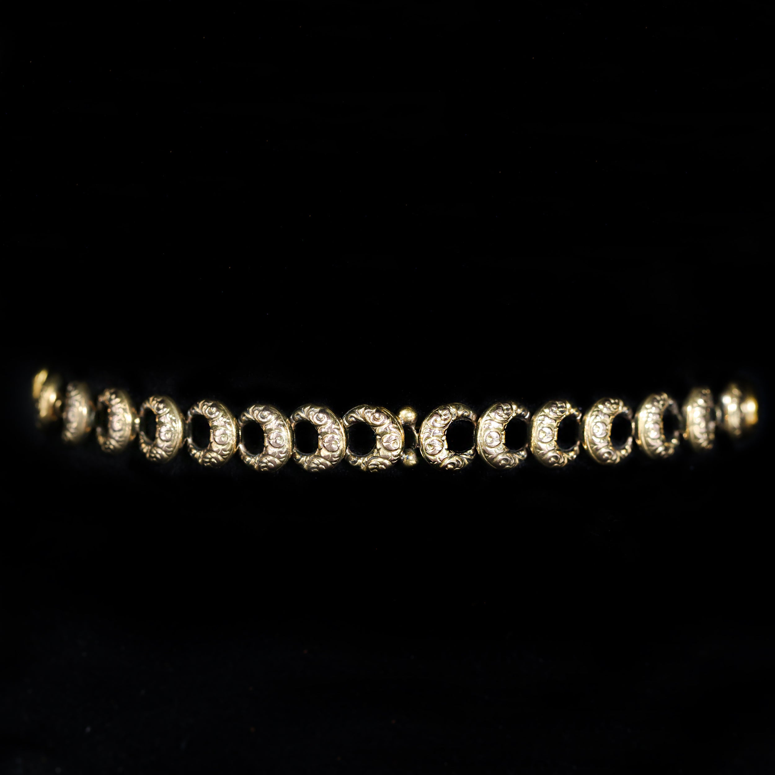 Victorian 14K yellow gold and sapphire bracelet. A Victorian era bracelet crafted in 14K yellow gold, this piece is composed of textured crescent moon links that meet at a beautifully detailed love knot clasp. At the center of the clasp rests a small round sapphire, adding a subtle pop of color and symbolism—crescent moons long associated with protection and renewal, and love knots representing unity and devotion. Finished with a safety chain, this 7.25 inch long bracelet is both romantic and thoughtfully made, a charming survivor of 19th-century sentiment and design.